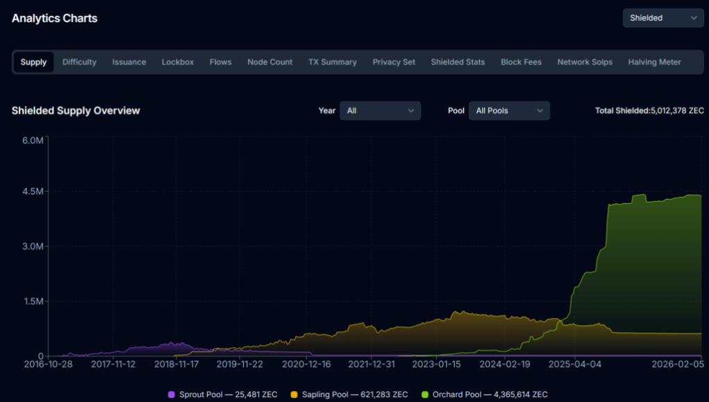 - ZEC shielded supply is stabilizing around 5,000 ZEC and hasn’t flinched in this bear market, showing users still care about private transactions. .