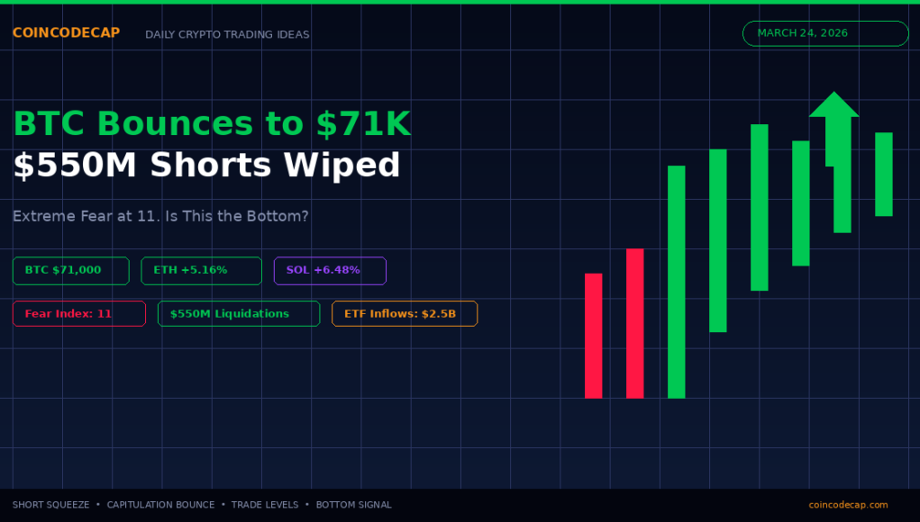 I woke up to green candles this morning for the first time in what feels like weeks. Bitcoin ripped from overnight lows near $68,200 all the way back to $71,000 in a move that wiped out $550 million worth of short positions across major exchanges.