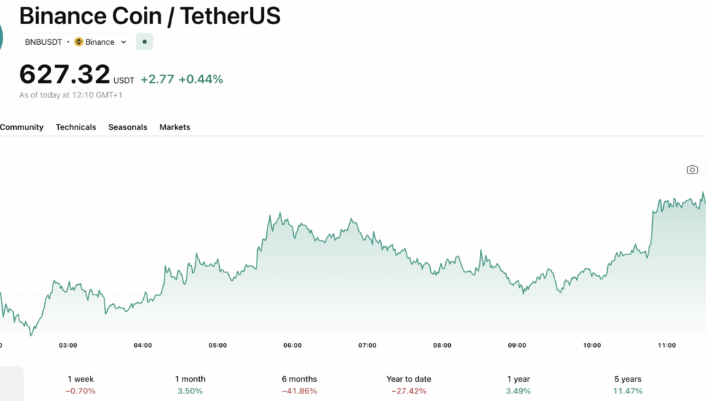 This advancement comes as BNB has moved modestly by +1% over the past 24 hours, trading at $627, with daily trading volume hitting $838M. The Binance-backed asset has been trading in a tight range, evidenced by its 30-day gain of just +1.2%.