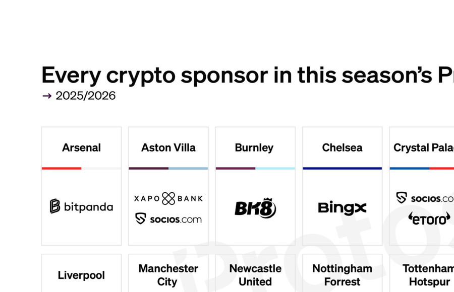Home Coinbase CHART: Every crypto sponsor in this year’s Premier League Coinbase CHART: Every crypto sponsor in this year’s Premier League By Felicity Short - March 10, 2026 48 0 FacebookTwitterPinterestWhatsAppCopy URL The number of Premier League football teams entering into partnerships with crypto sponsors fell this year from 14 to 13. Source link RELATED ARTICLESMORE FROM AUTHOR Bitcoin and M2: A link that falls apart on close inspection Crypto star GCR allegedly front-ran Teeka Tiwari’s picks, Binance listings DWF Labs-backed USDf depegs as red flags raised over quality of backing LEAVE A REPLY Cancel replyLog in to leave a comment Don't Miss XRP $150 Price Target? The $13.5 Trillion Reality Julia Parr - March 4, 2026 Is ChatGPT Changing the Way We Write? Joseph Rees - February 24, 2026 From Coinbase to Ripple: A Roster of Crypto Figures and Firms Named in the... Julia Parr - February 12, 2026 The 3 Best Portable Jump Starters in 2026: Get Charged Up Joseph Rees - April 3, 2026 Pledditor vanishes from X as bitcoin hits all-time high Felicity Short - April 11, 2026