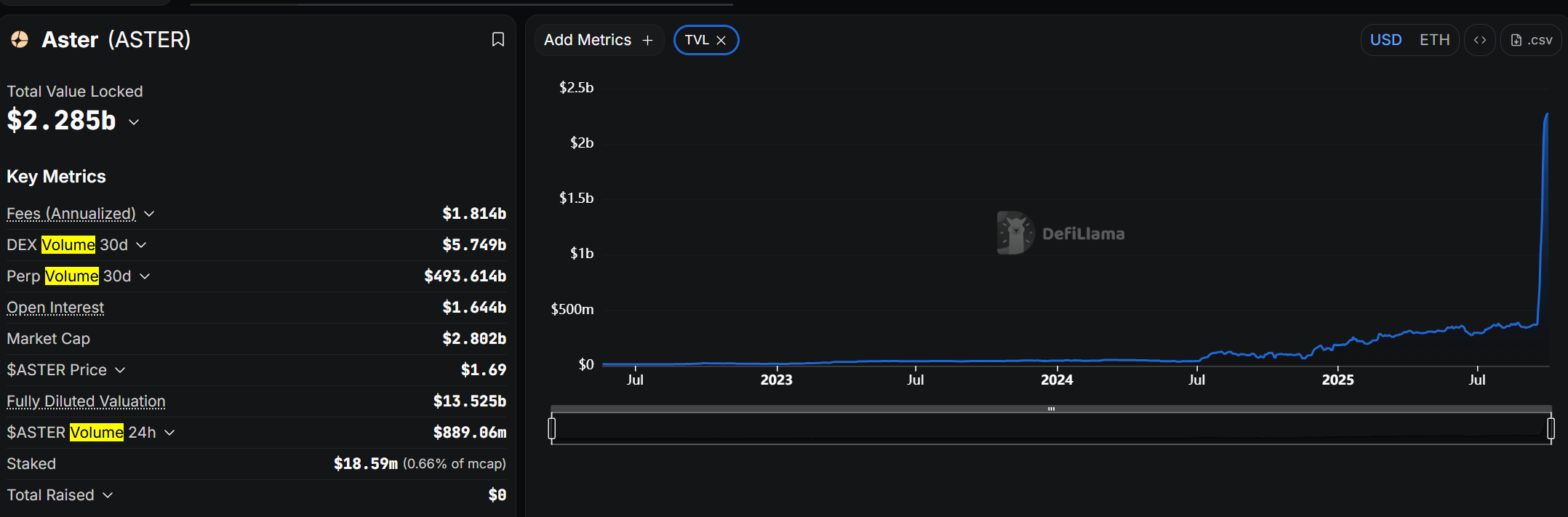 Despite volatility, ASTER is thriving on the fundamentals. According to DeFiLlama, the BNB-based DEX is recording nearly $1 Bn in daily trading volume and holds more than $2.26 Bn in total value locked (TVL).