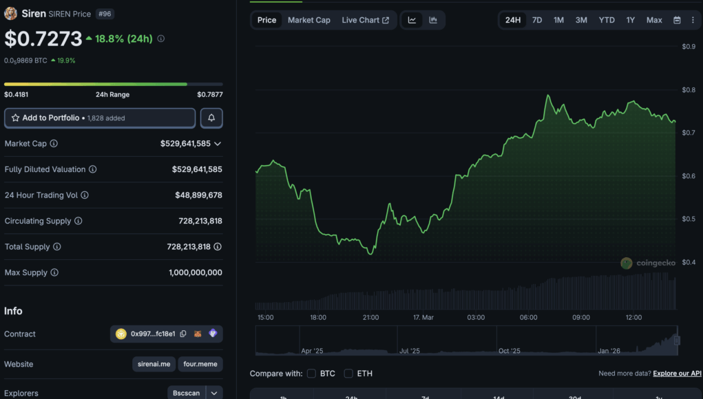 SIREN crypto has emerged as a standout performer in a choppy market, surging above the $0.70 level while major caps struggle for direction. The BSC-based token is currently trading over $0.72, posting a volatile 24-hour performance that has seen it top daily gainer lists.